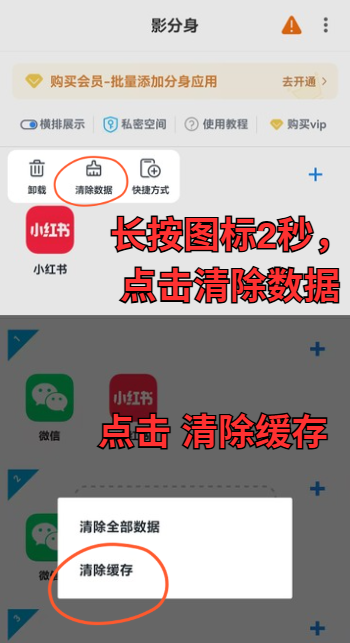 (2)、长按应用图标2秒,点击清理数据,清理一下缓存,点旁边的+号重新导入分身,再次打开应用即可正常启动(即覆盖目前的分身应用,账户信息依然在)。